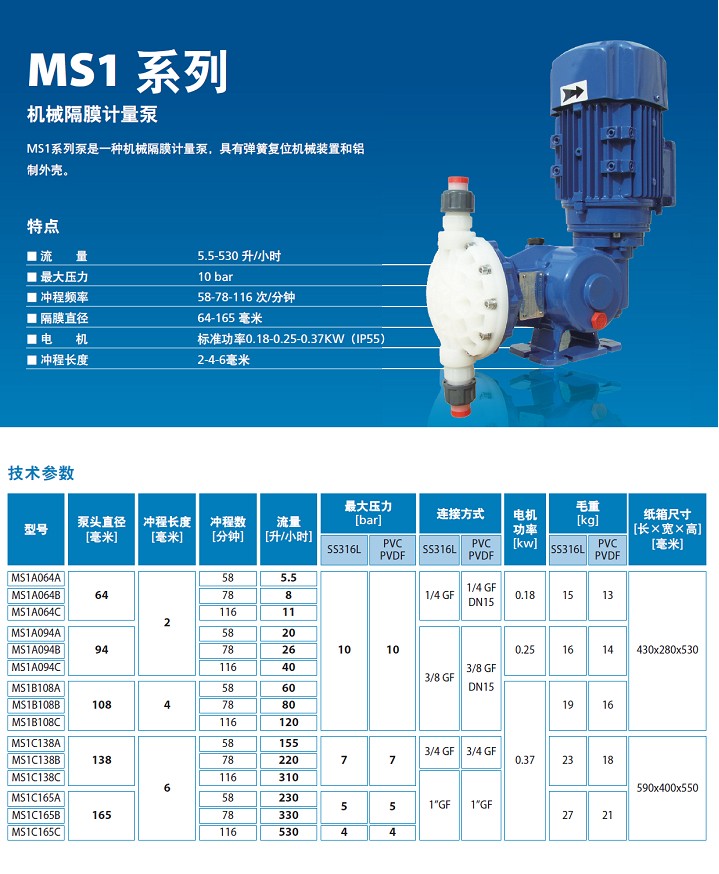 SEKO机械隔膜计量泵MS系列分为MS1、MS3、MS4三个系列 机械隔膜计量泵型号 最大流量 最大压力 隔膜计量泵描述 MS1A064A 5.5L/H 10BAR SEKO机械隔膜计量泵 MS1A064B 8L/H SEKO机械隔膜计量泵 MS1A064C 11L/H SEKO机械隔膜计量泵 MS1A094A 20L/H SEKO机械隔膜计量泵 MS1A094B 26L/H SEKO机械隔膜计量泵 MS1A094C 40L/H SEKO机械隔膜计量泵 MS1B108A 60L/H SEKO机械隔膜计量泵 MS1B108B 80L/H SEKO机械隔膜计量泵 MS1B108C 120L/H SEKO机械隔膜计量泵 MS1C138A 155L/H 7BAR SEKO机械隔膜计量泵 MS1C138B 220L/H SEKO机械隔膜计量泵 MS1C138C 310L/H SEKO机械隔膜计量泵 MS1C165A 230L/H 5BAR SEKO机械隔膜计量泵 MS1C165B 330L/H SEKO机械隔膜计量泵 MS1C165C 530L/H 4BAR SEKO机械隔膜计量泵 MS3C165H 660L/H SEKO机械隔膜计量泵MS3系列 MS4H210L 800L/H SEKO机械隔膜计量泵MS4系列 MS4H210C 1000L/H SEKO机械隔膜计量泵MS4系列